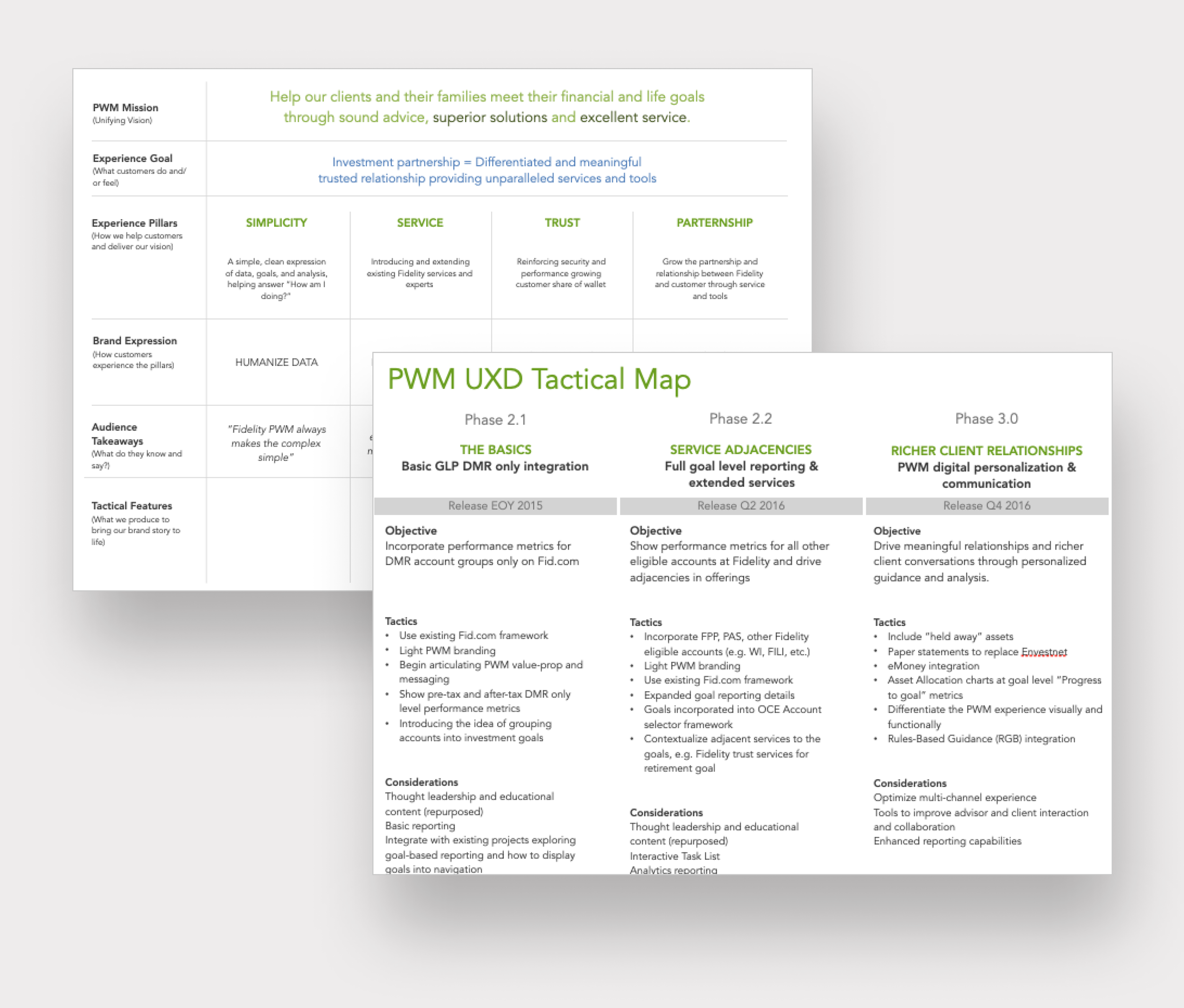 At Fidelity, I was tasked with taking an idea from concept to delivery, navigating the complex needs of high-net-worth individuals. Leveraging the team’s mature design process, I led alignment exercises to define mission, goals, design pillars, and audiences, then mapped a phased approach with clear tactics and outcomes.
